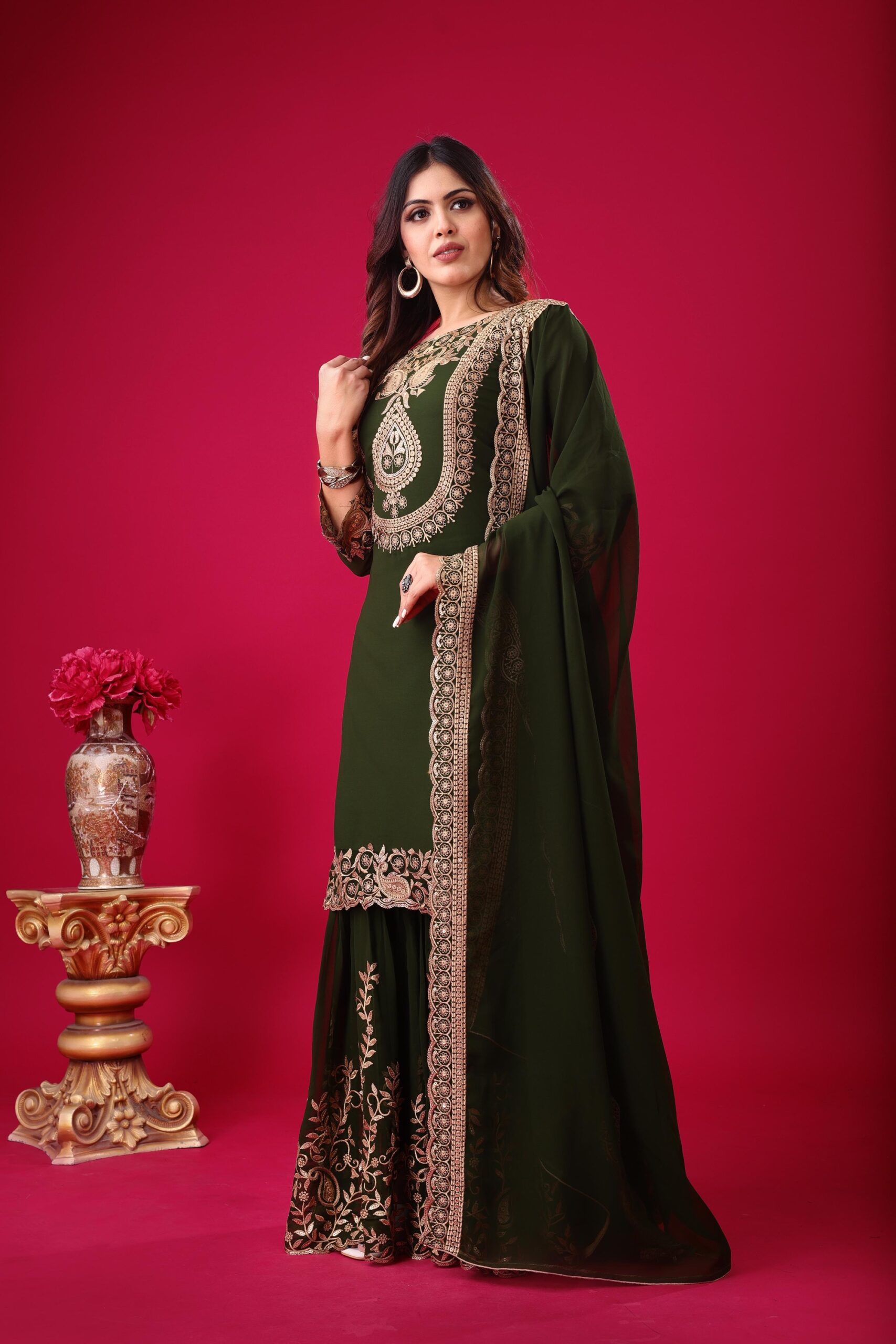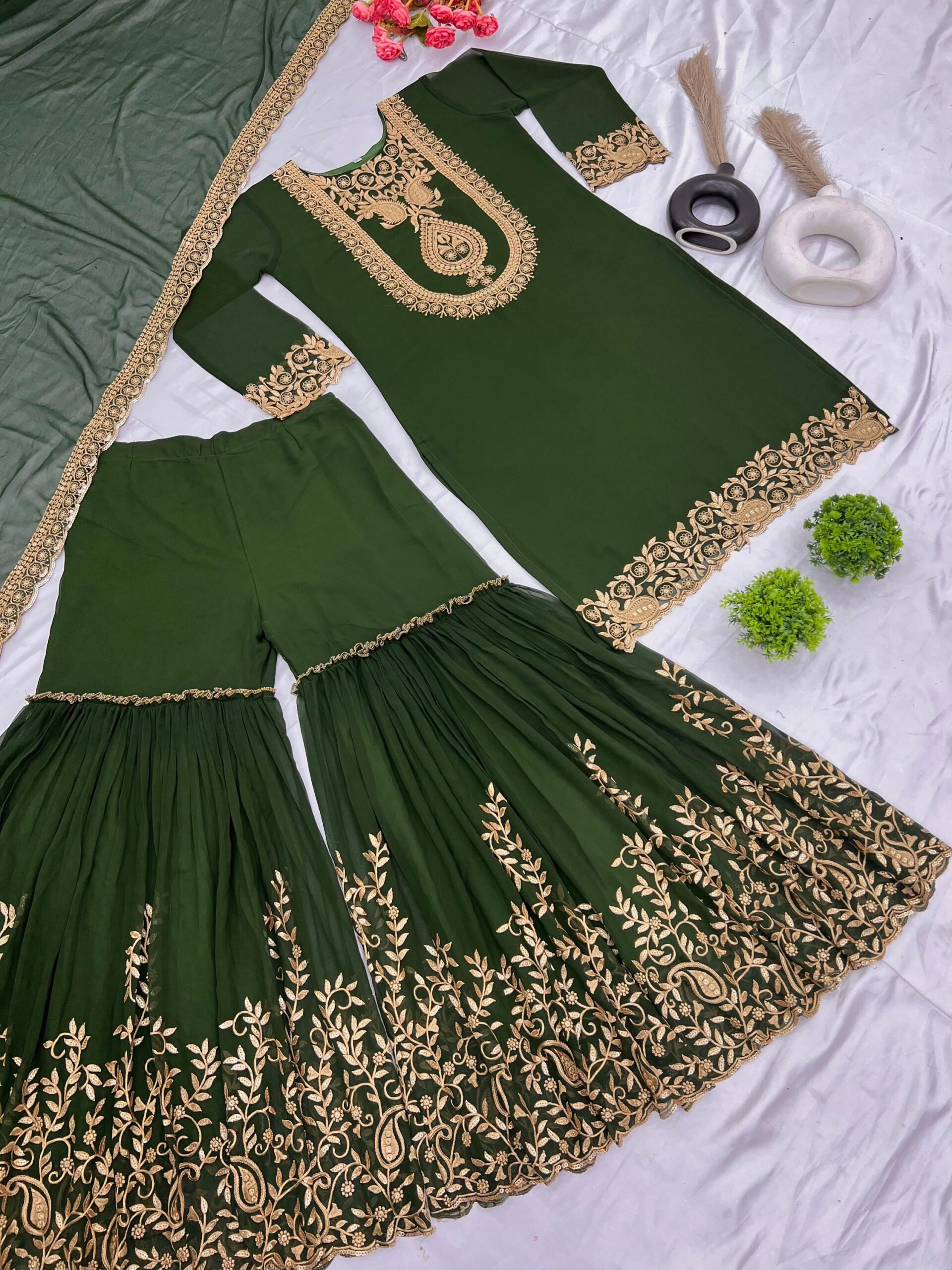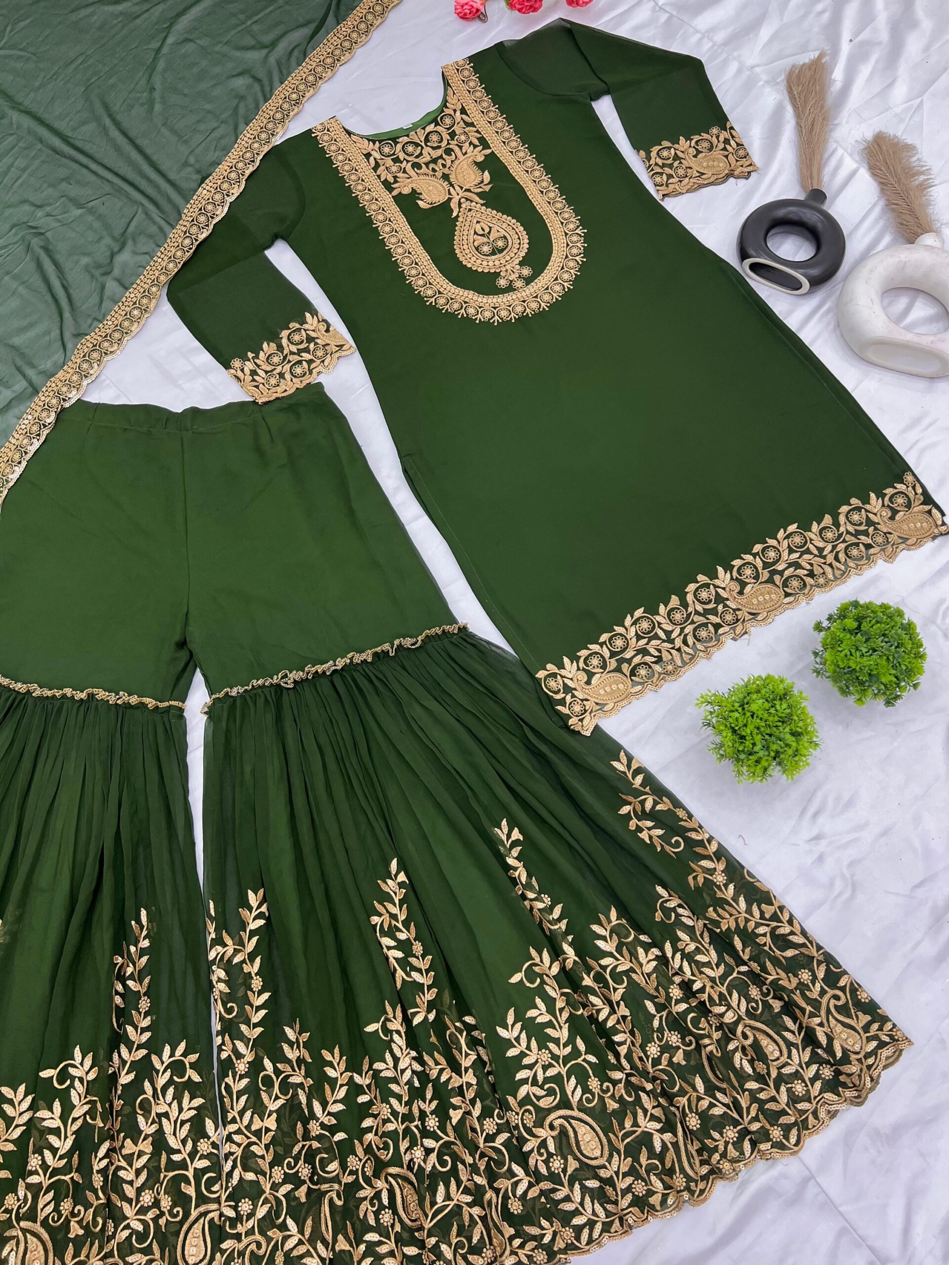 Elevate your ethnic wardrobe with this Blooming Faux Georgette Designer Set. Featuring a heavily embroidered top, comfortable stitched plazzo, and a matching embroidered dupatta with lace border, this set is fully stitched and ready to wear. Available in sizes M–XXL, it’s perfect for festive occasions, parties, and ethnic celebrations. Lightweight, stylish, and crafted with premium fabrics, this set ensures comfort without compromising on elegance.