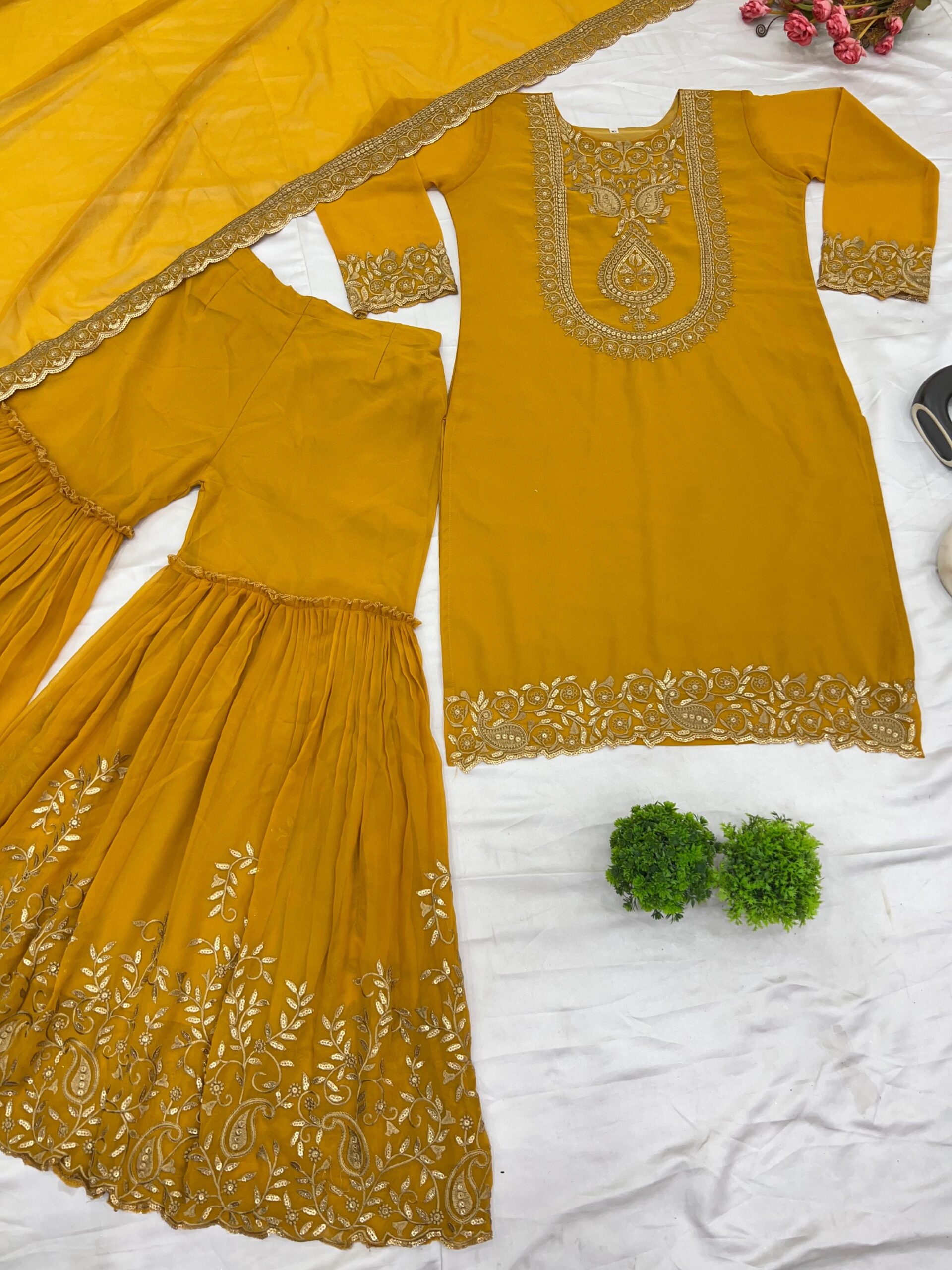 Elevate your ethnic wardrobe with this Blooming Faux Georgette Designer Set. Featuring a heavily embroidered top, comfortable stitched plazzo, and a matching embroidered dupatta with lace border, this set is fully stitched and ready to wear. Available in sizes M–XXL, it’s perfect for festive occasions, parties, and ethnic celebrations. Lightweight, stylish, and crafted with premium fabrics, this set ensures comfort without compromising on elegance.